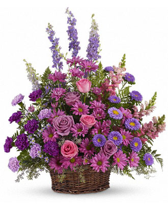 We highly recommend the Gracious Lavender Basket as a thoughtful choice. This stunning flower basket is filled with gorgeous purple, pink, and lavender blooms that are sure to offer solace to the eyes and heart. The basket features an array of roses, carnations, larkspur, matsumoto, monte cassino, and more.