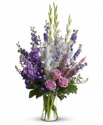 The lavender in this bouquet represents the departed's open heart and sweet disposition, while the roses symbolize their abundant love for their beloved and your support for the grieving family. Gladioli signify the deceased's strength and moral integrity, while larkspur conveys their ardent attachments and assures the bereaved that their loved one is in a better place. Heather speaks of your admiration for them, and asters wish them protection from further harm.