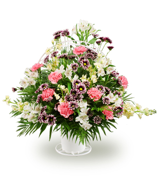 With soft tones of white, yellow, and purple, this bouquet is perfect for a farewell ceremony. The delightful stocks and greens on the sides capture the delicacy and splendor of life on earth.